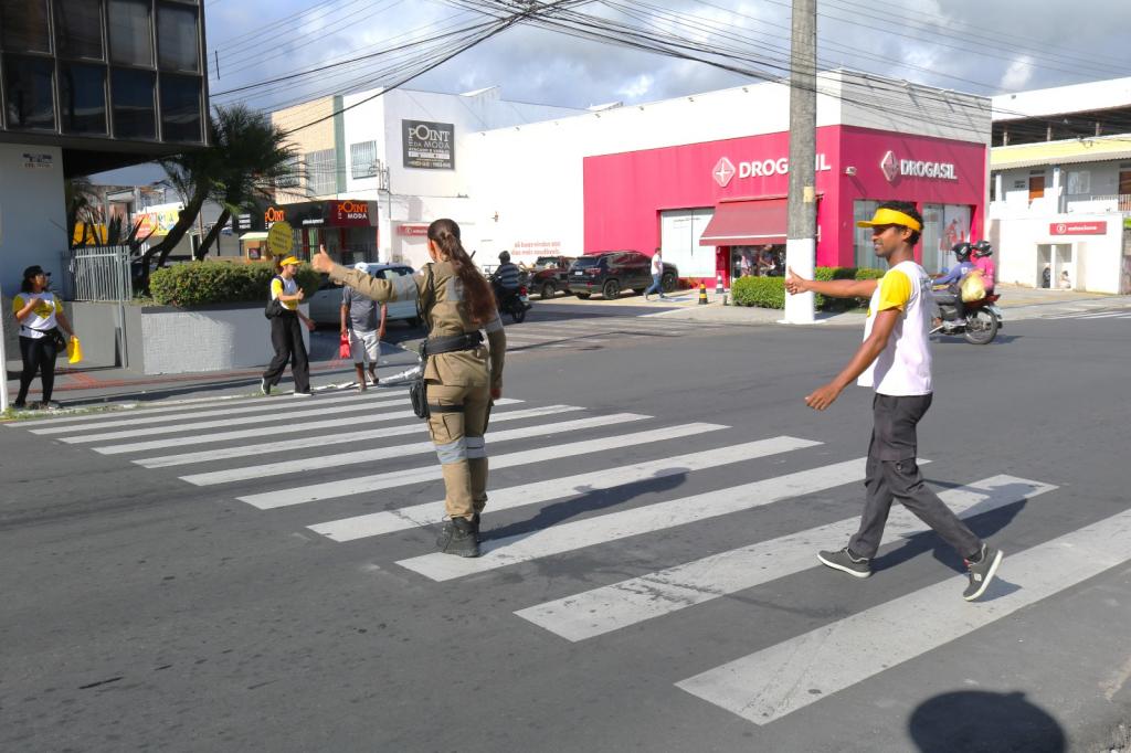 Equipe realizou abordagens educativas com condutores e pedestres, orientando sobre a importância de parar antes da faixa e garantir uma travessia segura